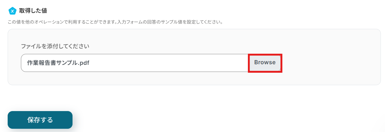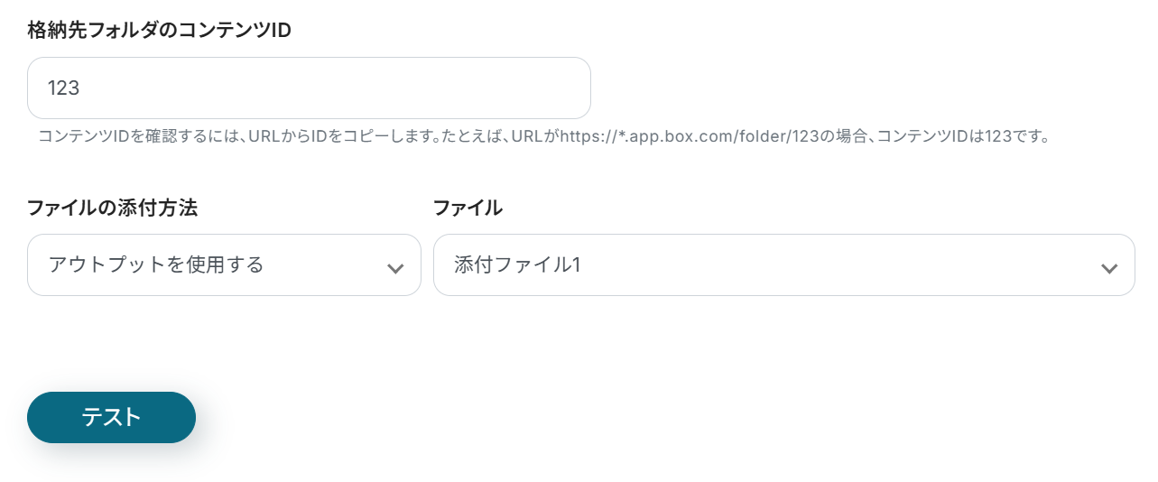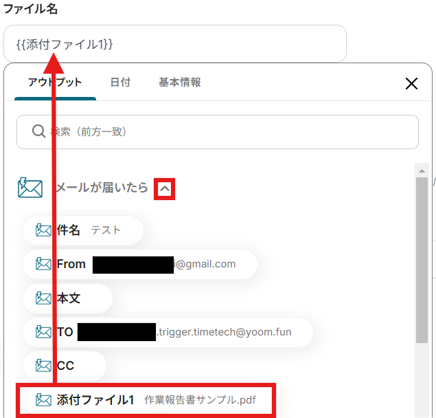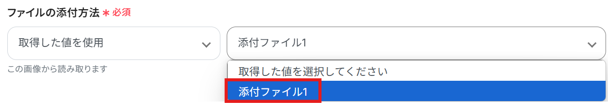 先ほど取得した添付ファイルを活用するので、以下のように設定してください。