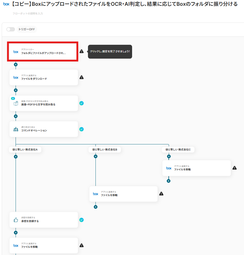 こちらのテンプレートはBoxのファイルアップロードをトリガーに、OCRでデータを取得し、Boxのフォルダに振り分けるフローとなっています。