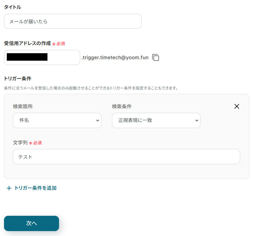 最初に、Yoomで設定したメールにメールが届いたらフローボットが起動する設定を行うため、「メールが届いたら」をクリックします。