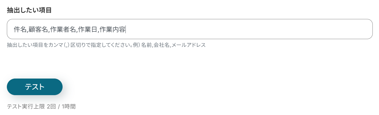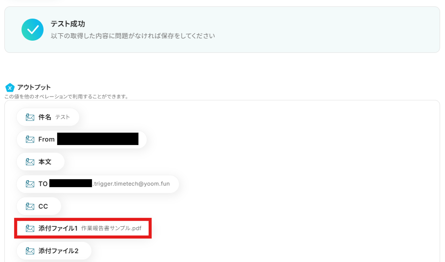 テストが成功すると、以下のように表示され、アウトプットにはメールから取得した値が自動的に入力されます。