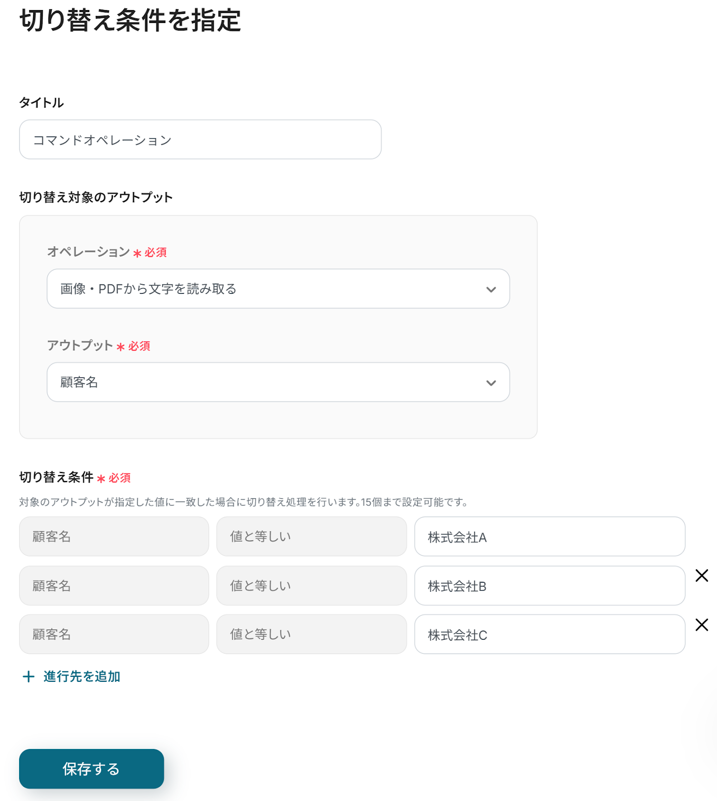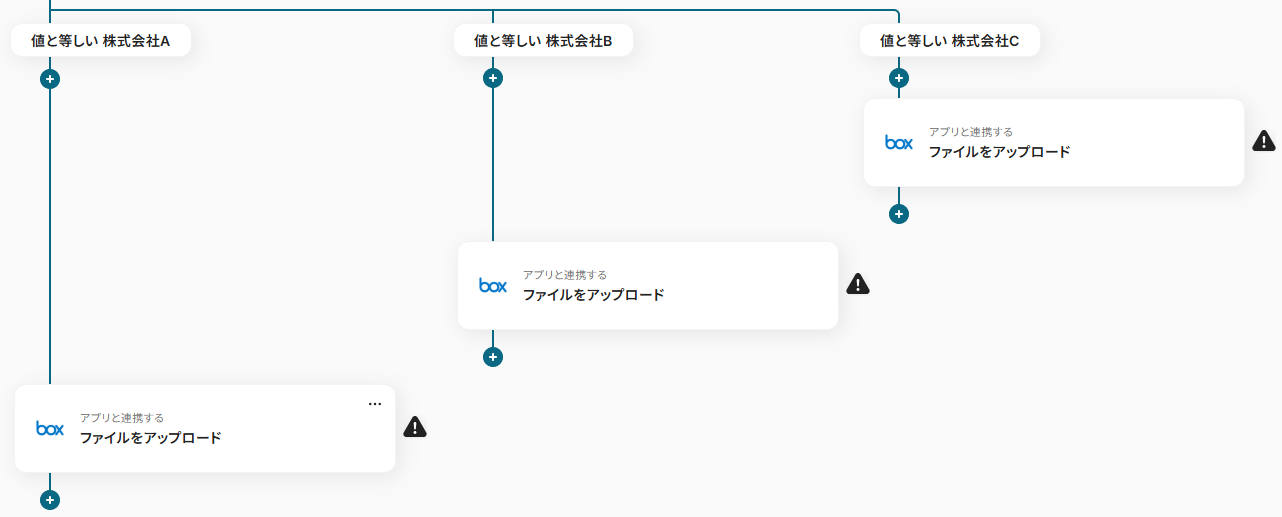 顧客ごとに進行先を切り替え、Boxにファイルをアップロードする設定にしたいので、今回は以下のように設定しました。