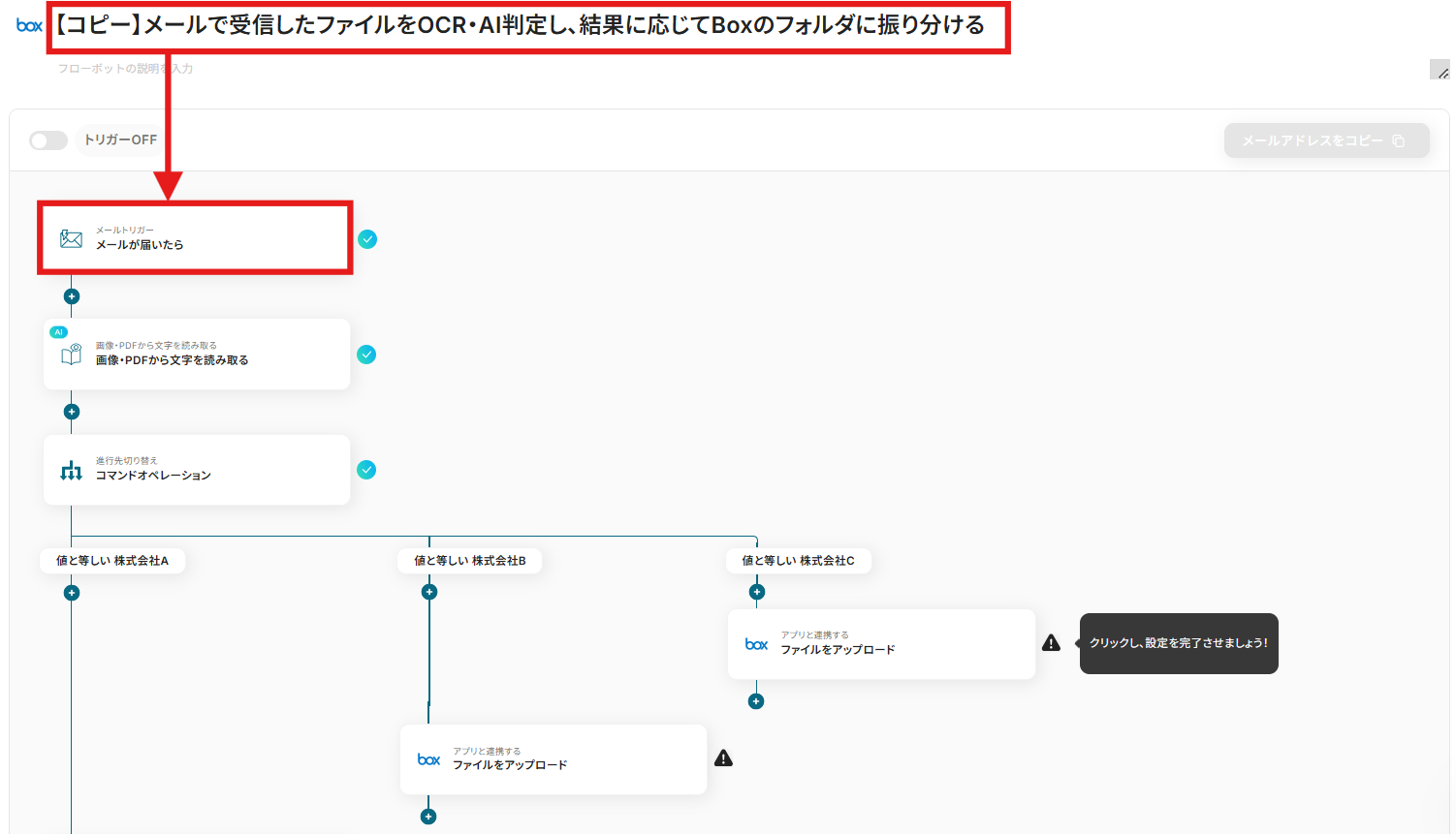 最初に、「メールで受信したファイルをOCR・AI判定し、結果に応じてBoxのフォルダに振り分ける」方法をご説明します。