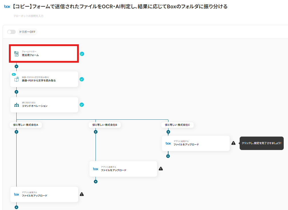 先ほど設定したテンプレートから派生して、こちらはフォームで送信されたファイルをOCRで取得し、Boxのフォルダに振り分けるフローとなっています。