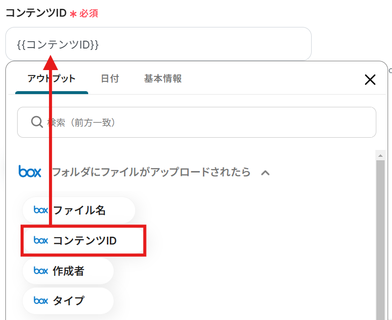 「フォルダにファイルがアップロードされたら」のアウトプットから選択してください。