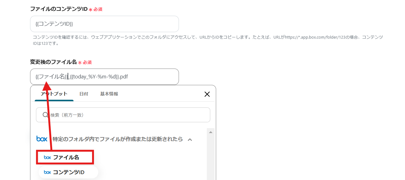 ファイル名は入力欄をクリックすると、以下の画面のようにBoxで取得した情報を引用できます。