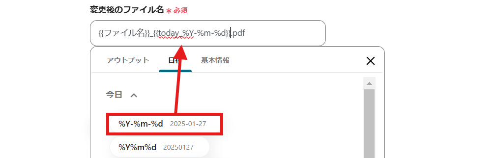 例えば、変更後のファイル名にBoxで取得したファイル名を入れたい場合は、以下のように「アウトプット」→「ファイル名」の順番にクリックします。