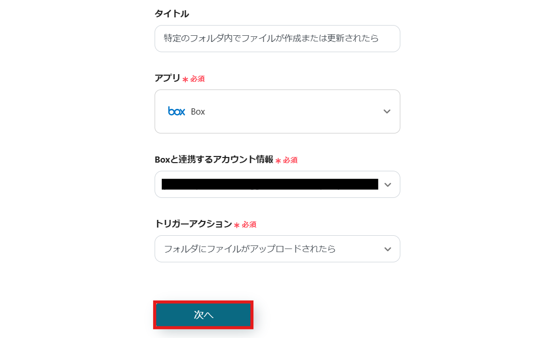 トリガーは「フォルダにファイルがアップロードされたら」を選択します。