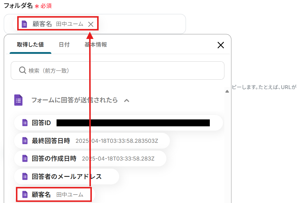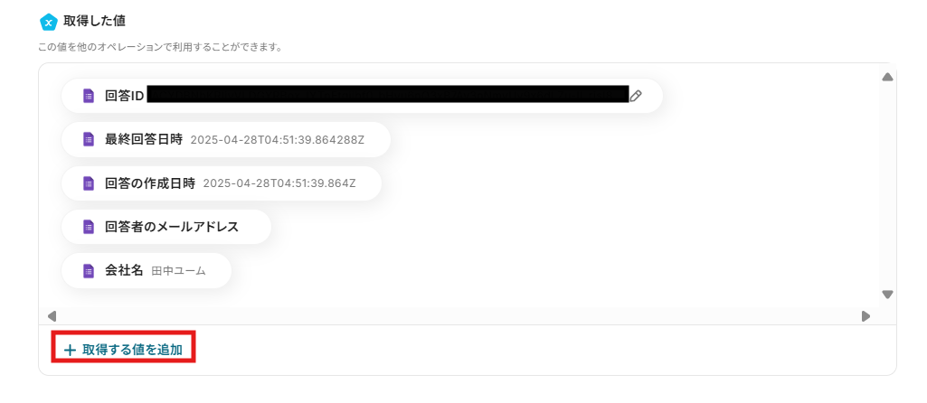 YoomのGoogleフォームでは、デフォルトで取得できる値が決まっています。