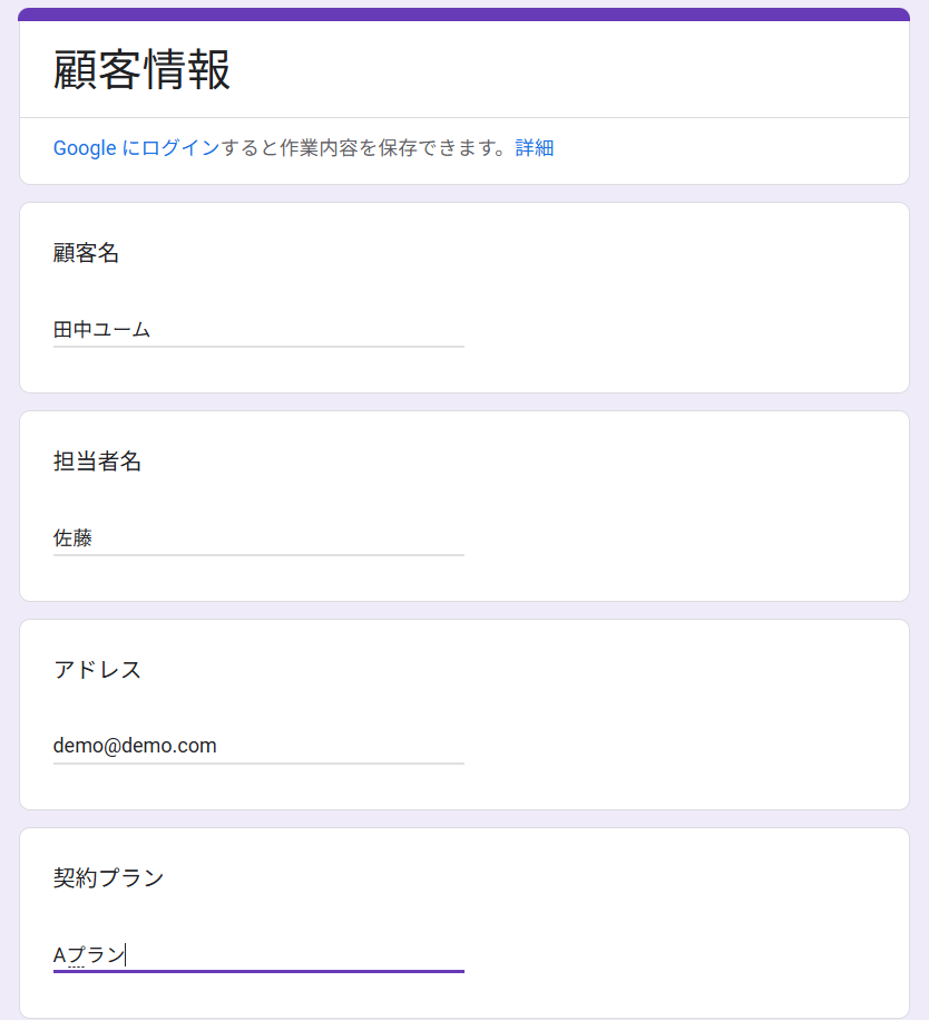 ここでGoogleフォームに、以下のようなテスト回答をします。