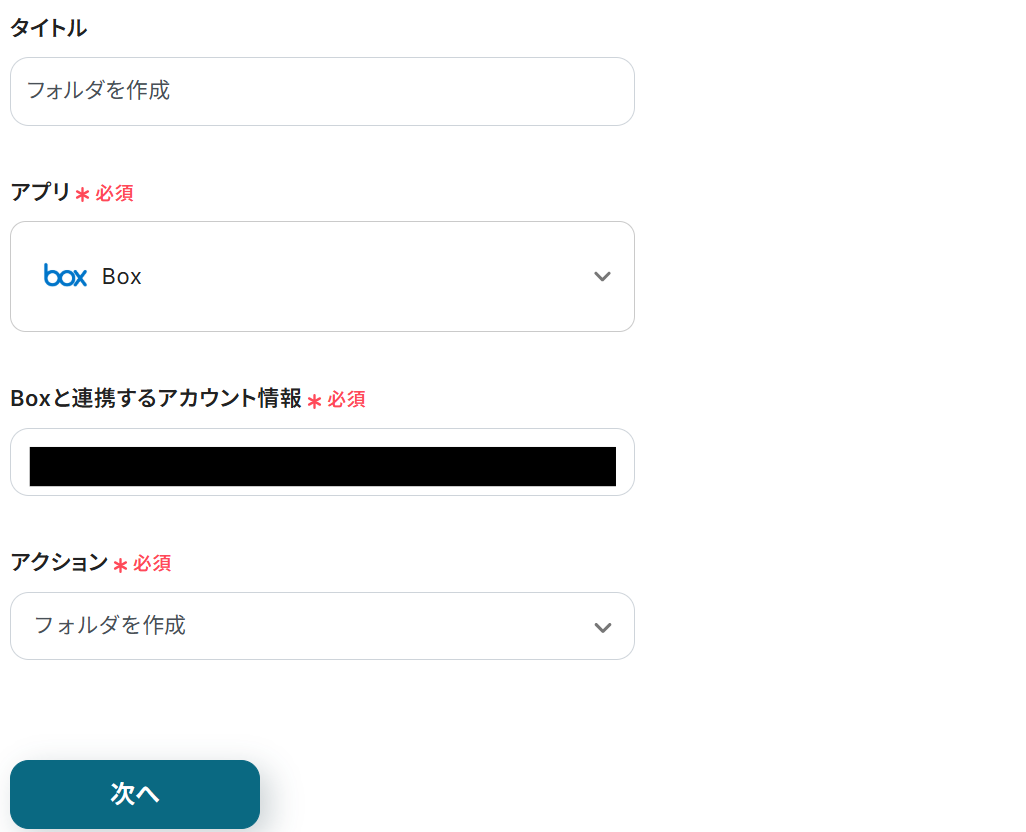 こちらもタイトルと連携するアカウント情報を任意で設定し、アクションはテンプレート通りのまま「次へ」をクリックして進んでください。