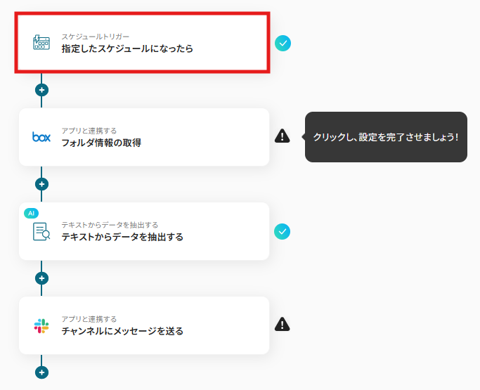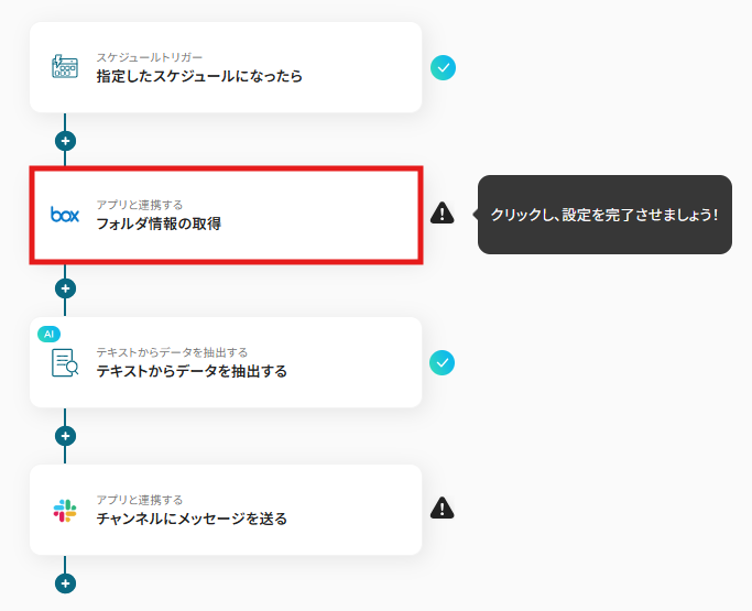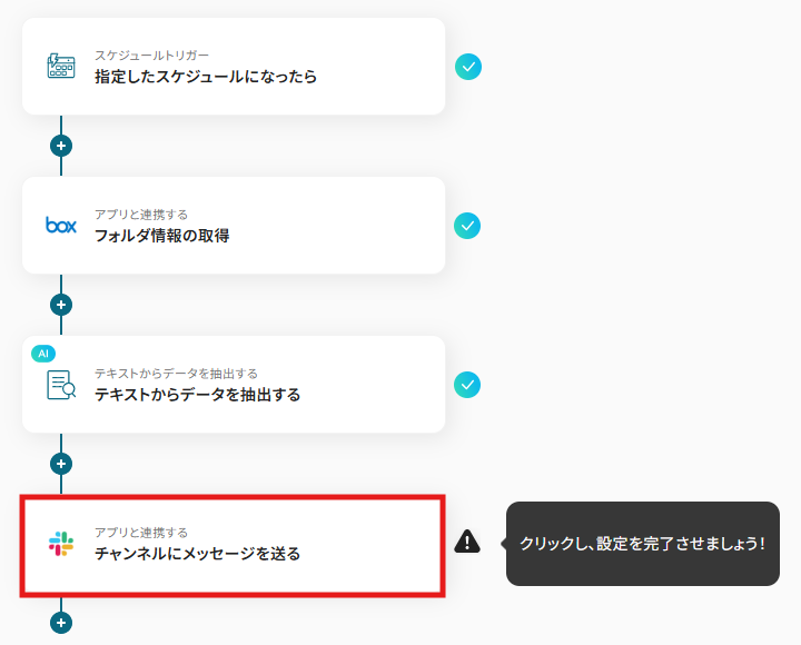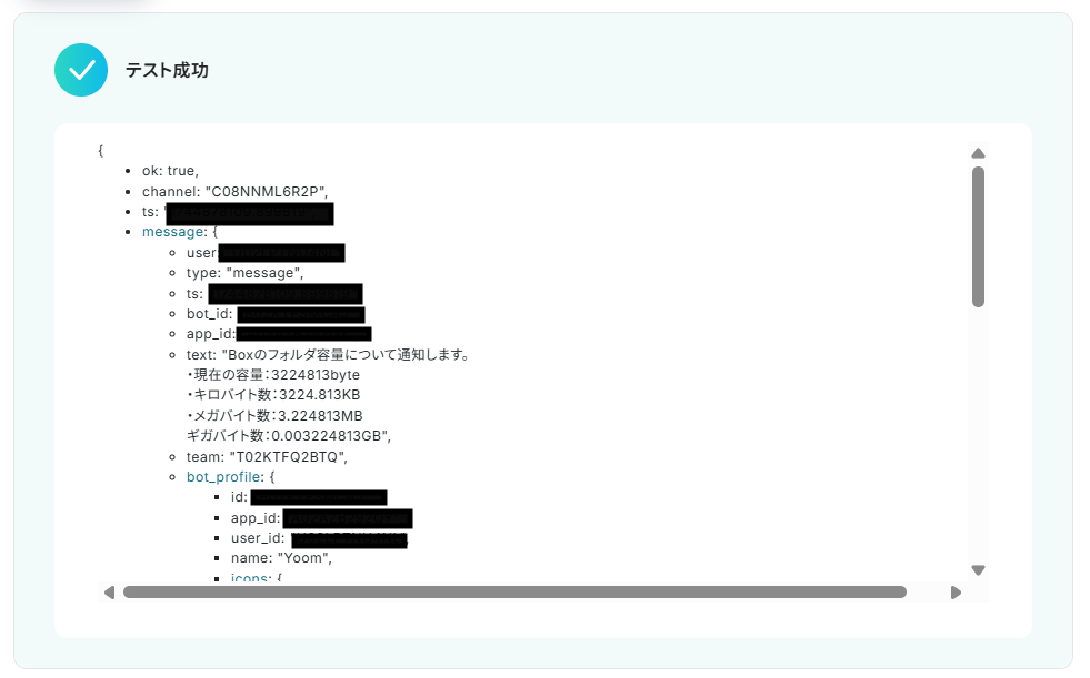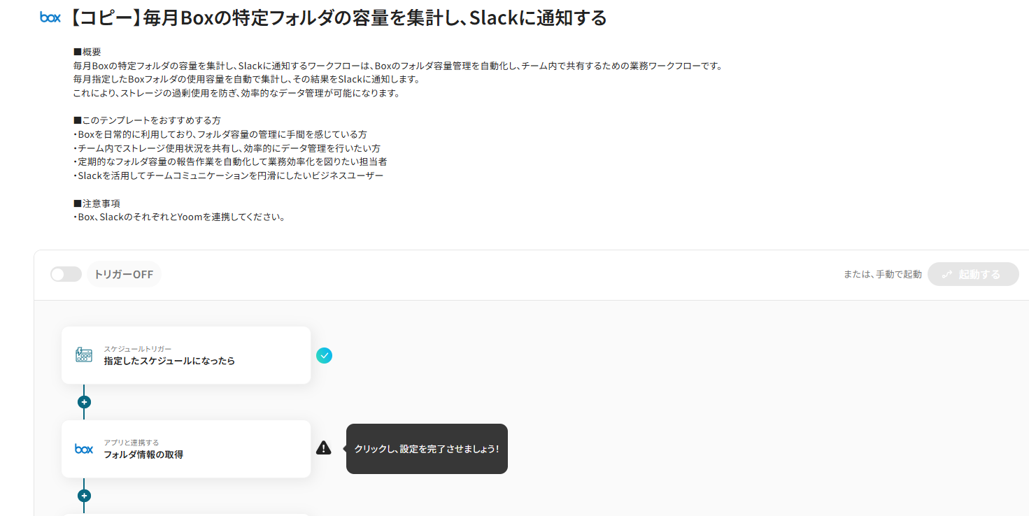 これで【毎月Boxの特定フォルダの容量を集計し、Slackに通知する】というフローが完成です。