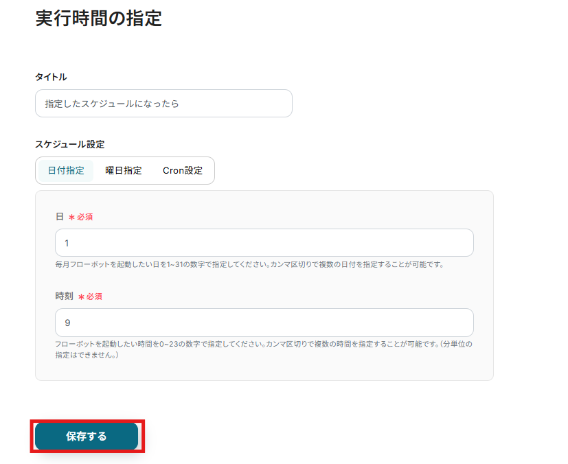 2) ここでは毎月1日の9時に起動するように入力されています。