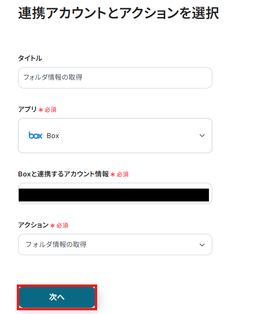 2) アクションは「フォルダ情報の取得」が選択されていることを確認して、「次へ」をクリックします。