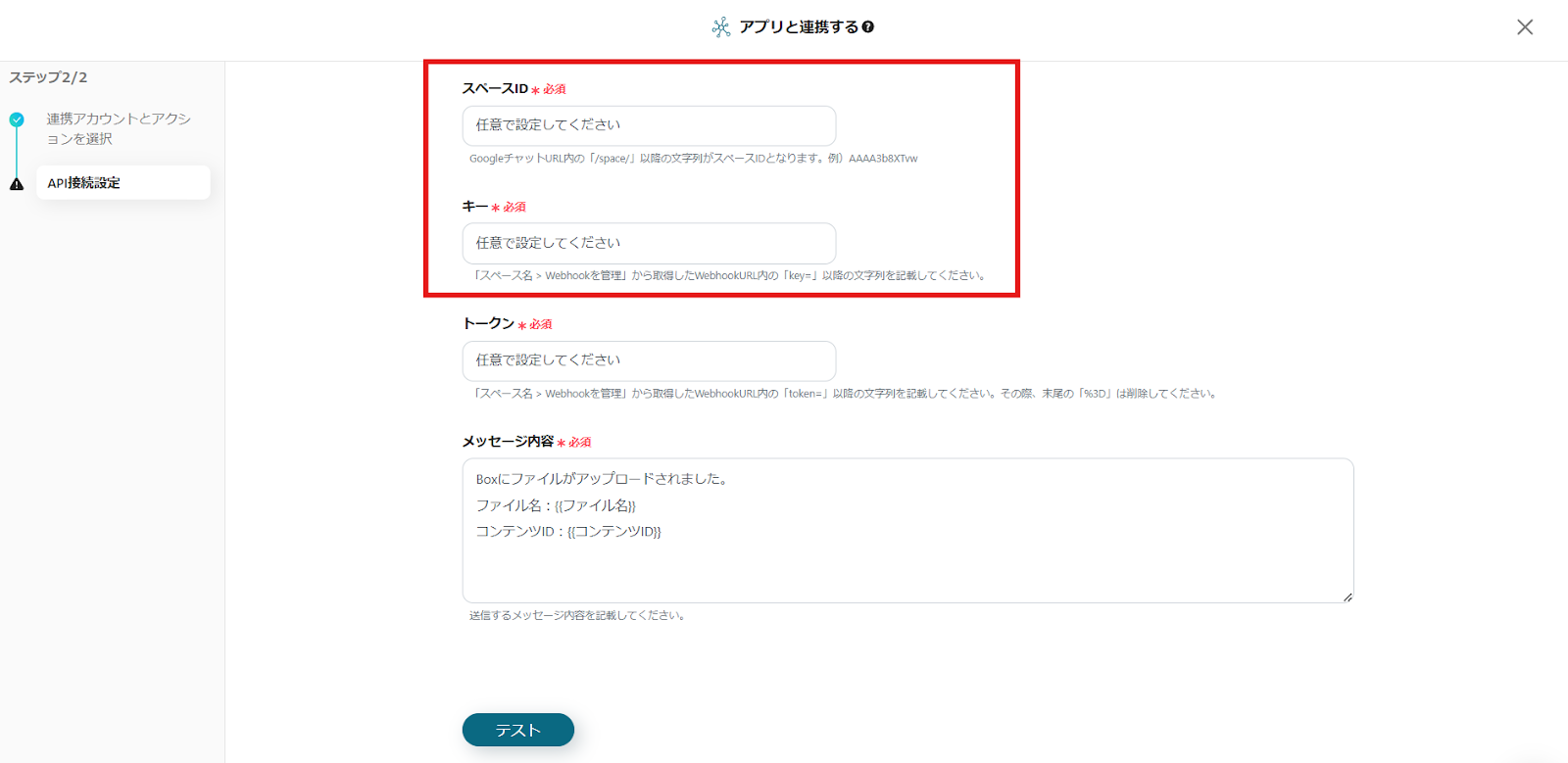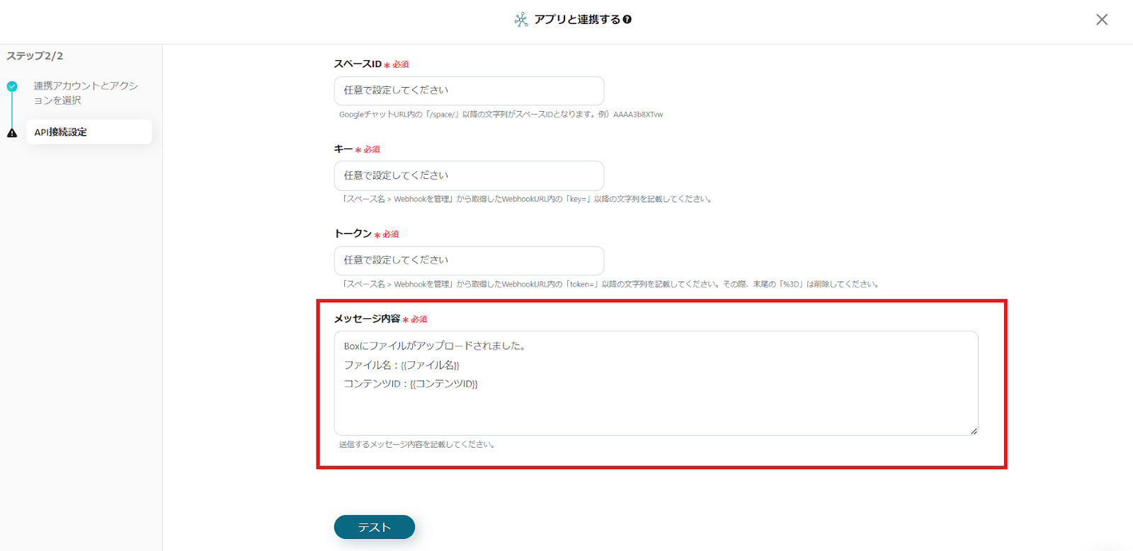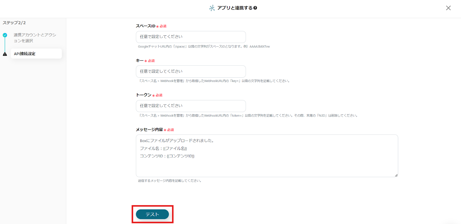 テスト成功と表示がされたら保存を押しましょう。この設定を終えることで、BoxにファイルがアップロードされるとBoxにメッセージがリアルタイムで送信されるようになります。