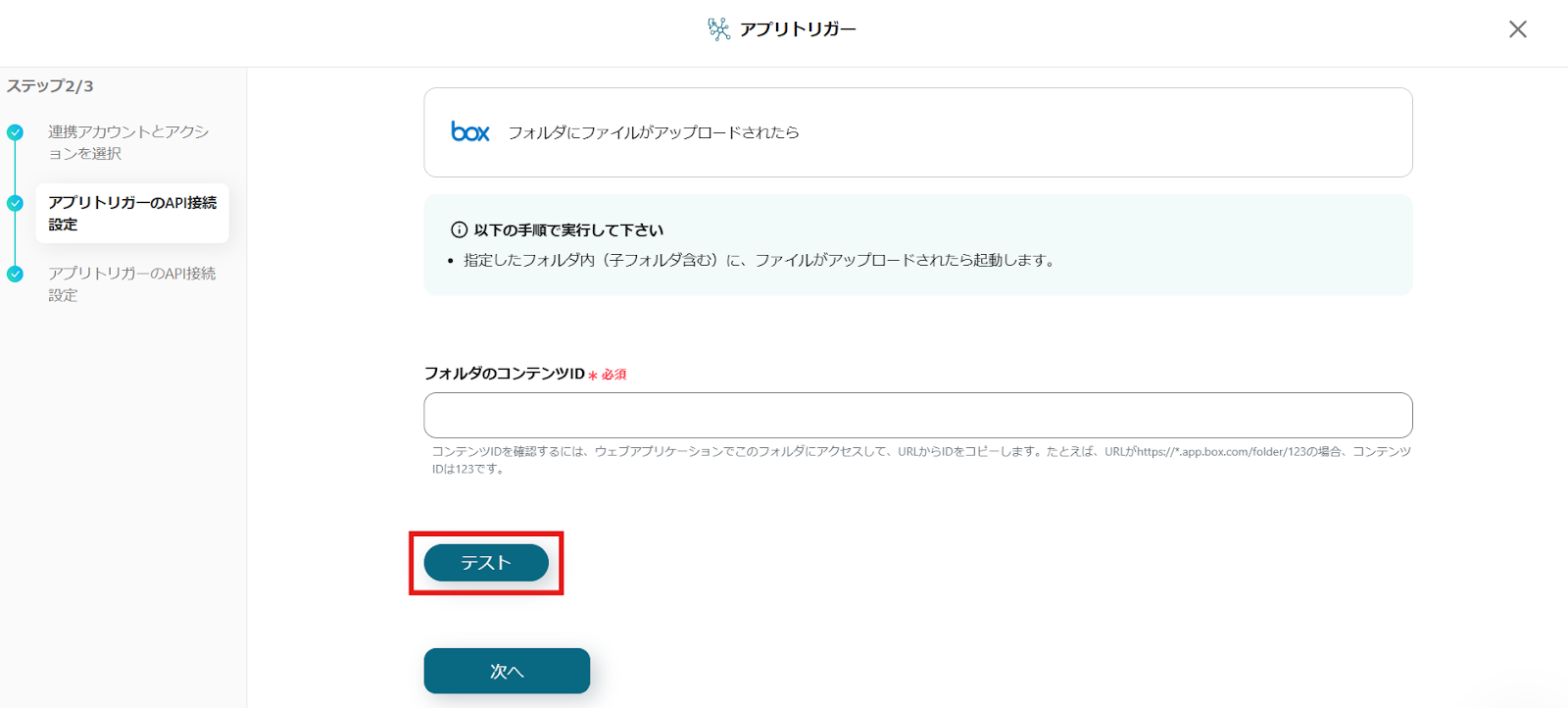 その後赤枠のテストボタンを押し、テスト成功と表示が出たら「次へ」を押します。