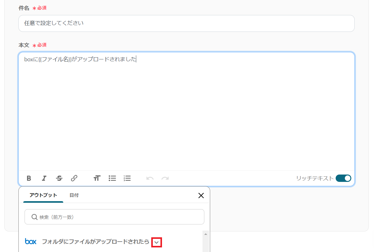 たとえば、Boxへファイルアップロード後にメールを送付するので、Boxにファイルがアップロードされたことを見逃すといったことが起こりにくいです。