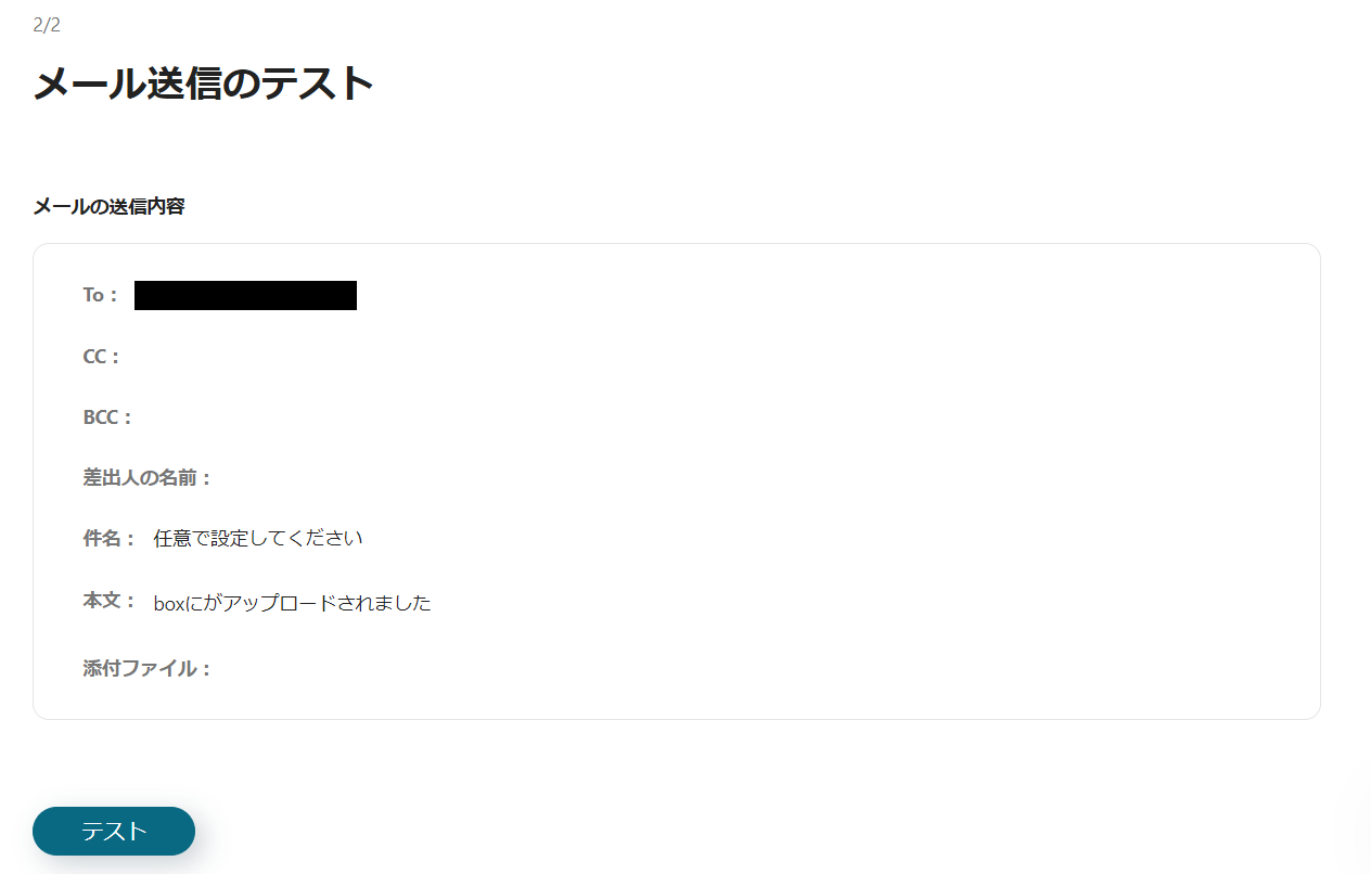 以下の画面が表示されるので、メールの内容が問題なければ、「テスト」→「テスト成功」→「保存」をします。