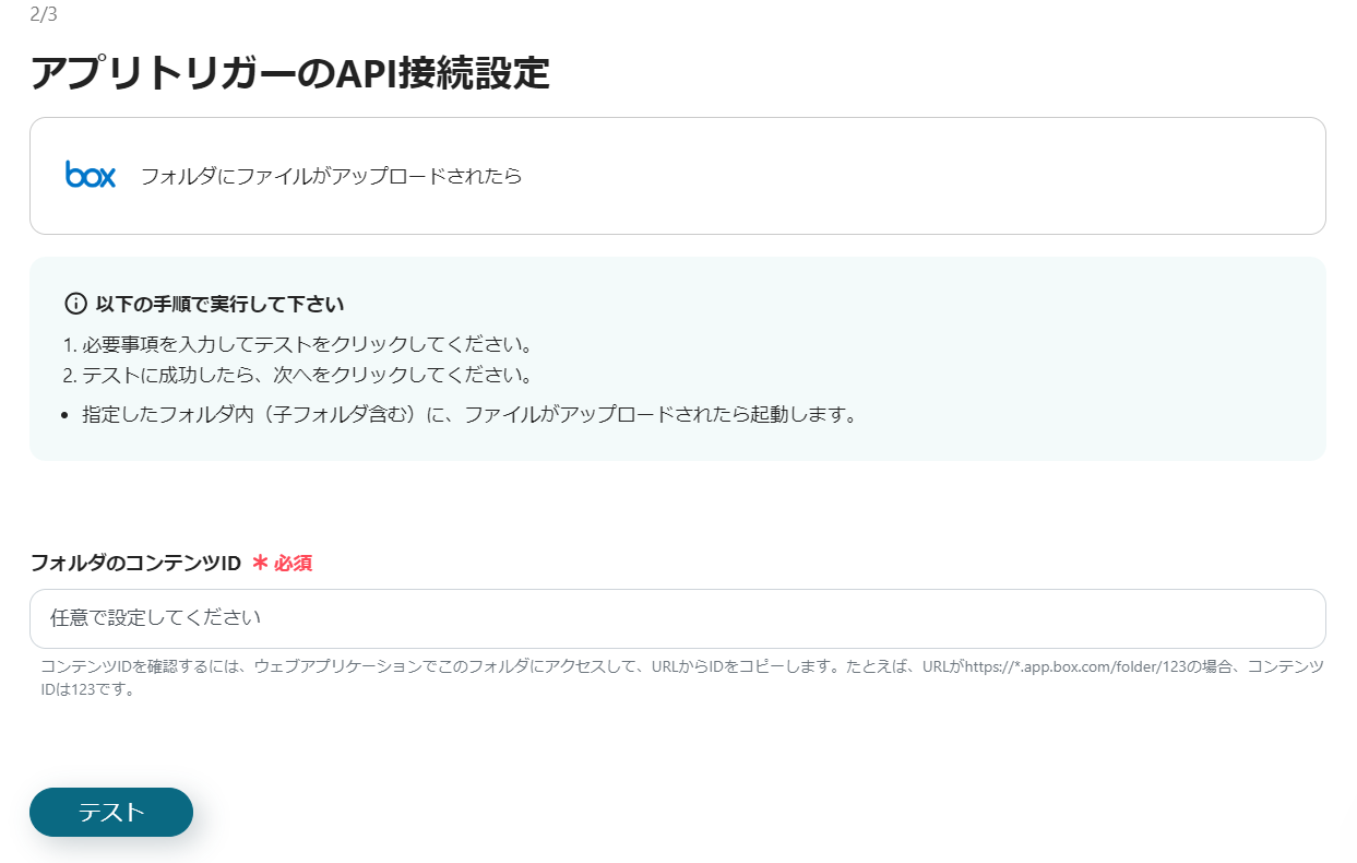 ※コンテンツIDを確認するには、ウェブアプリケーションでこのフォルダにアクセスして、URLからIDをコピーします。たとえば、URLがhttps://*.app.box.com/folder/123の場合、コンテンツIDは123です。