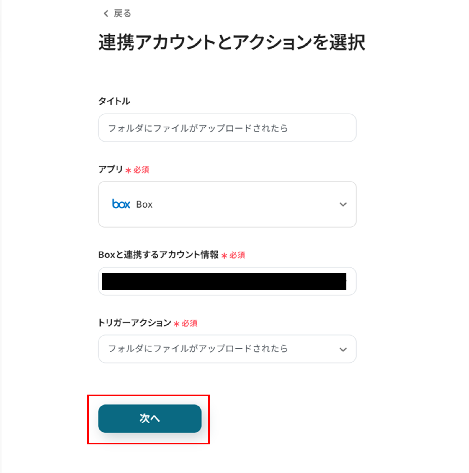 (2)Boxの「連携アカウントとアクションを選択」画面から、Boxと連携するアカウント情報に誤りがないかを確認し、トリガーアクションは「フォルダにファイルがアップロードされたら」のままで「次へ」をクリックします。