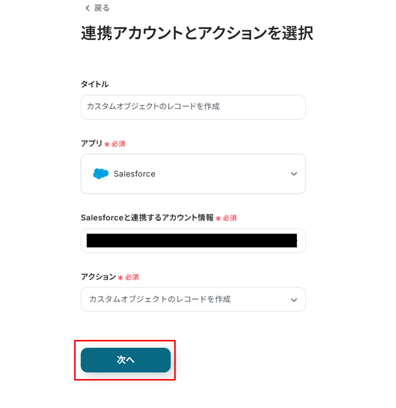 (2)Salesforceの「連携アカウントとアクションを選択」画面から、Salesforceと連携するアカウント情報に誤りがないかを確認し、アクションは「カスタムオブジェクトのレコードを作成」のままで「次へ」をクリックします。