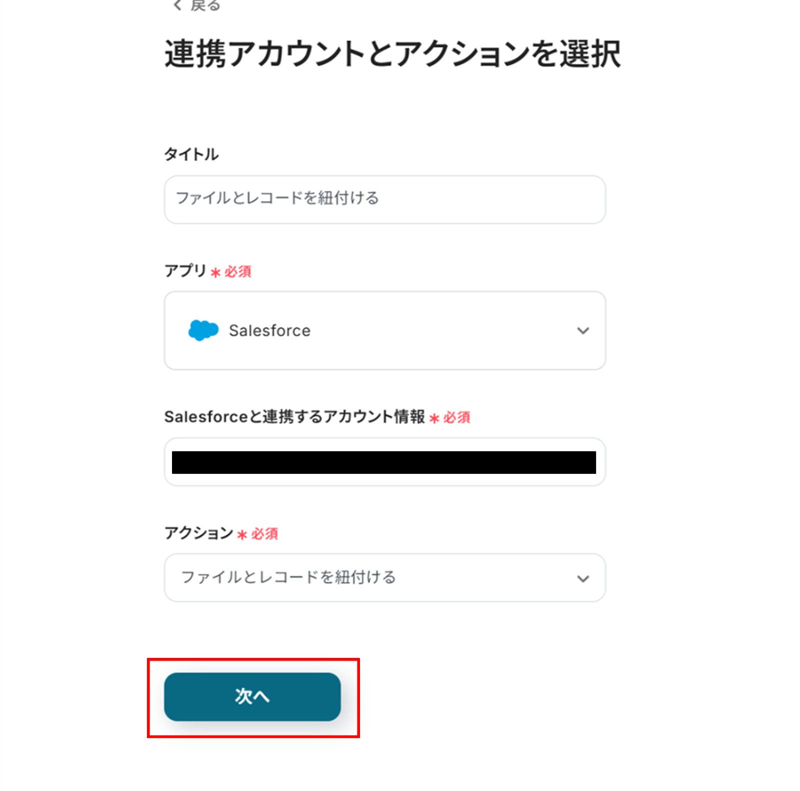 (2)Salesforceの「連携アカウントとアクションを選択」画面から、Salesforceと連携するアカウント情報に誤りがないかを確認し、アクションは「ファイルとレコードを紐付ける」のままで「次へ」をクリックします。