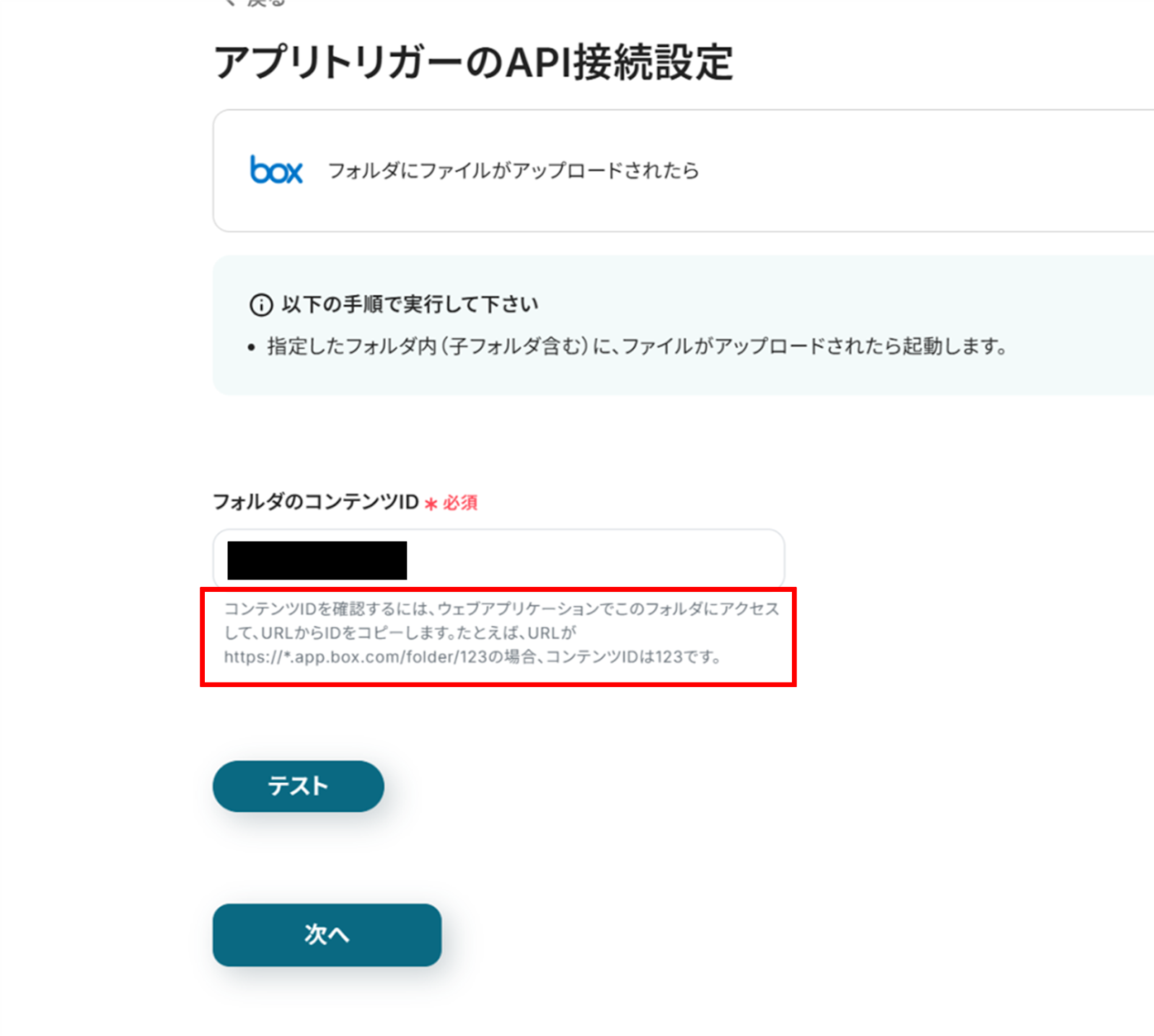 (3)「アプリトリガーのAPI接続設定」画面から、赤枠を確認の上、フォルダのコンテンツIDを入力します。