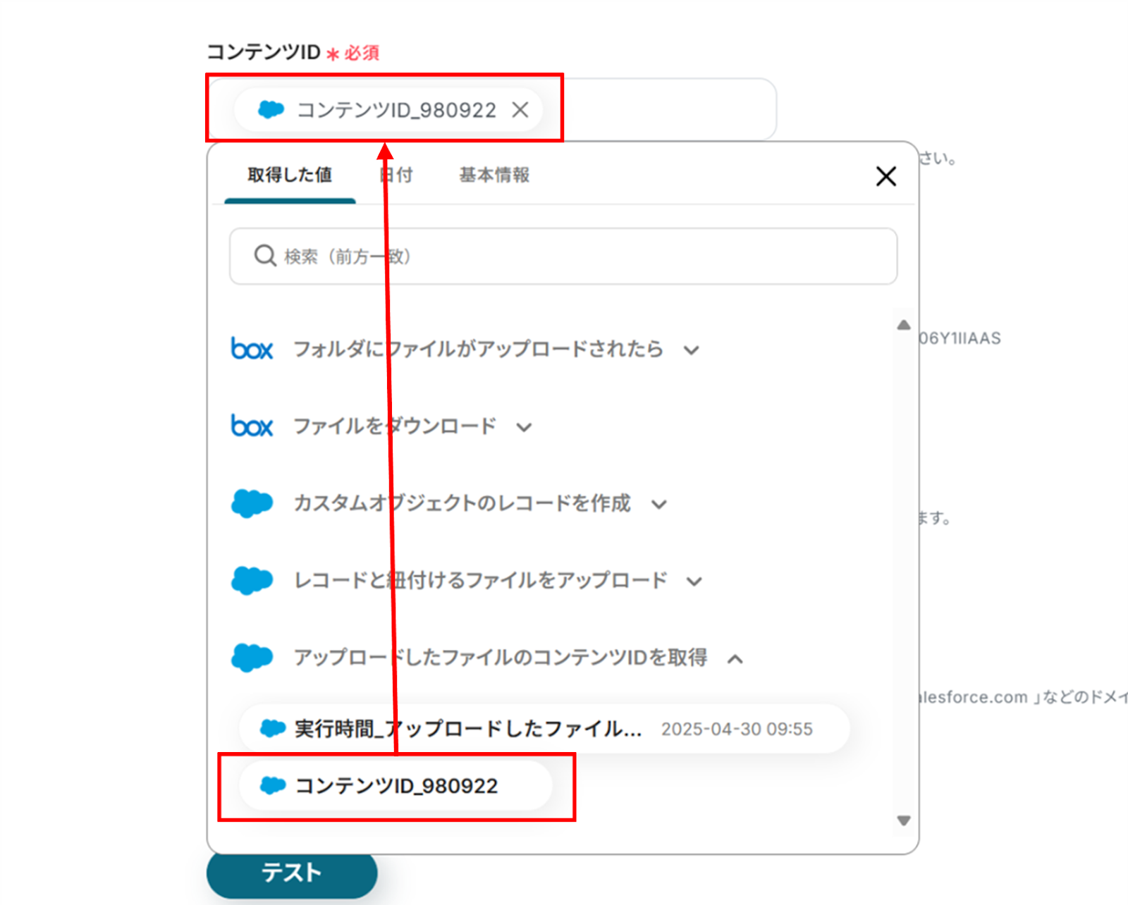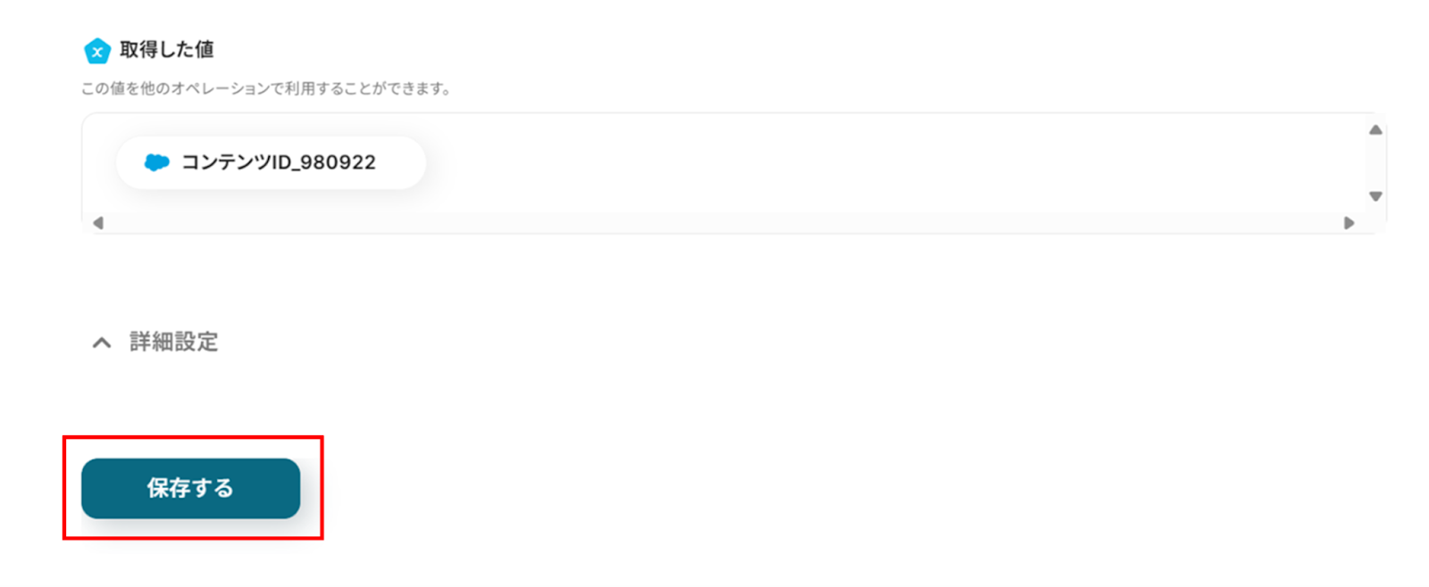 テストに成功すると、取得した値に「コンテンツID_数字」が取得できます。