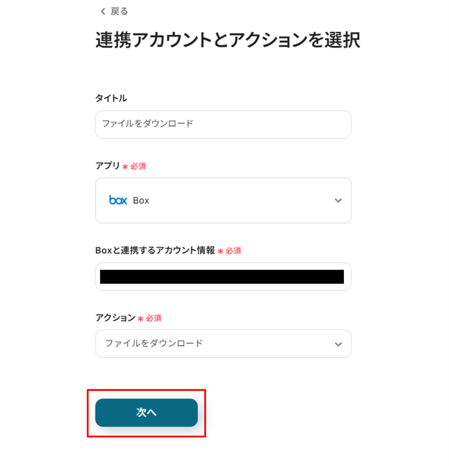 (2)Boxの「連携アカウントとアクションを選択」画面から、Boxと連携するアカウント情報に誤りがないかを確認し、アクションは「ファイルをダウンロード」のままで「次へ」をクリックします。