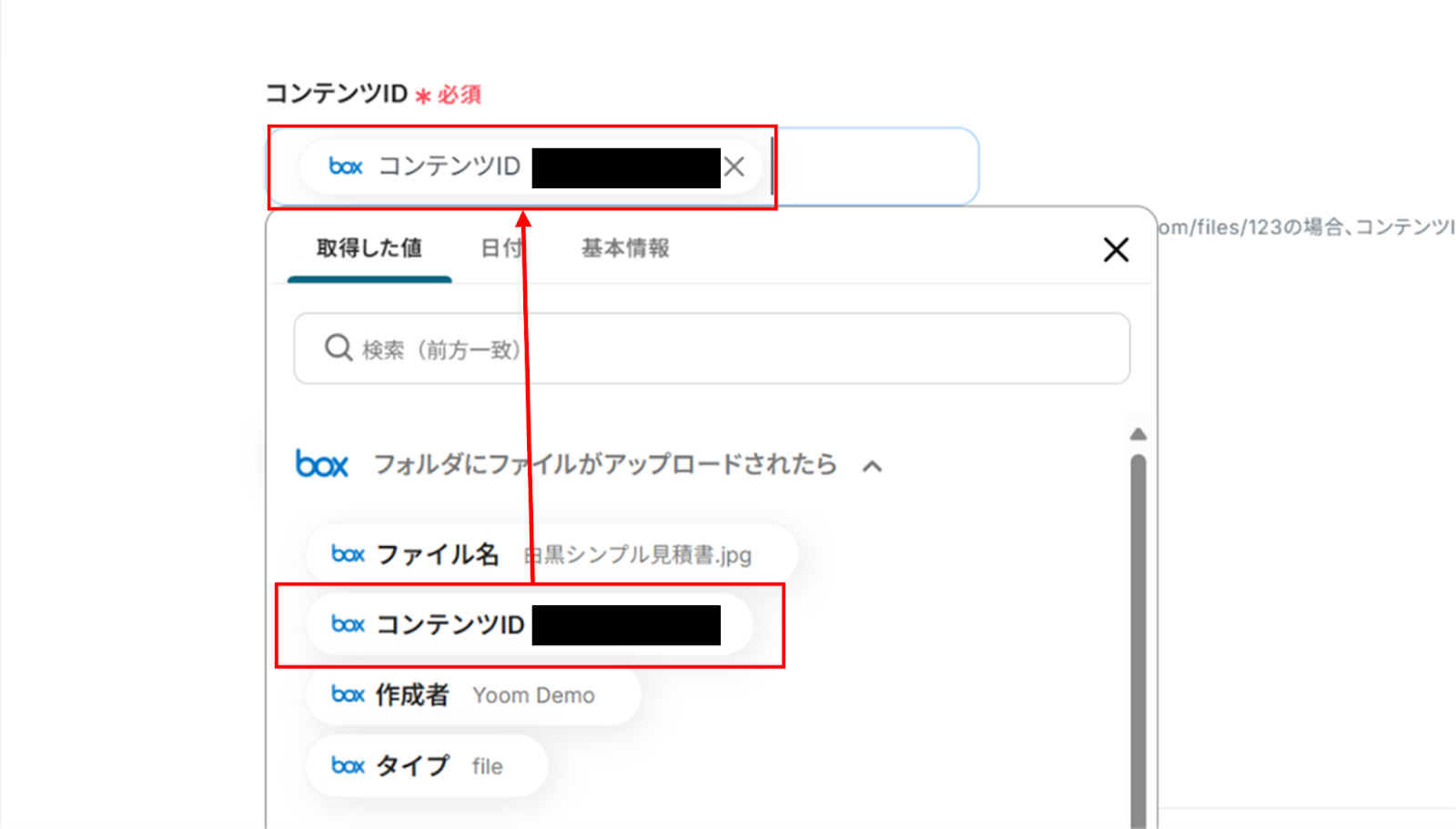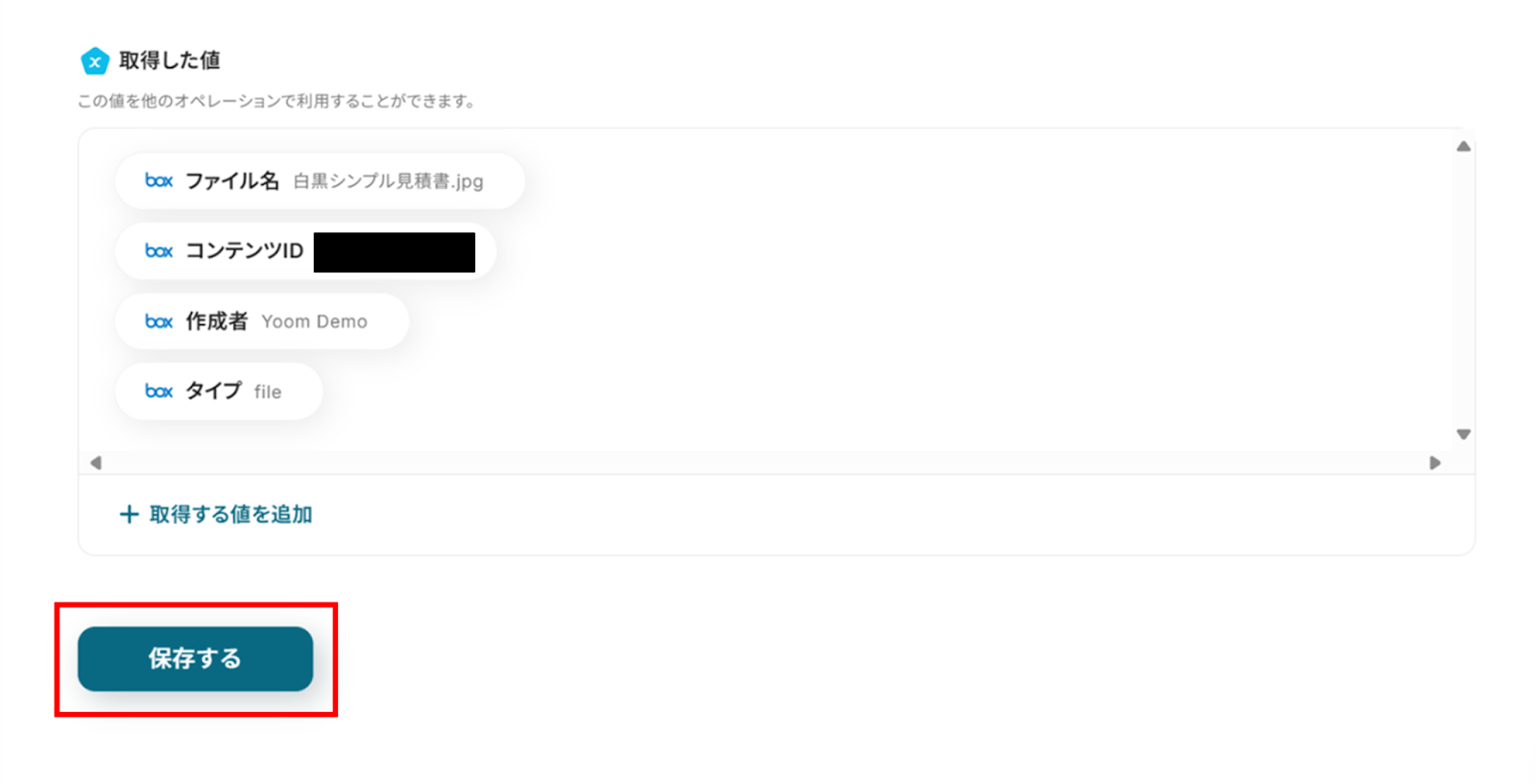 「取得した値」にBoxの情報が反映されればテスト成功です。