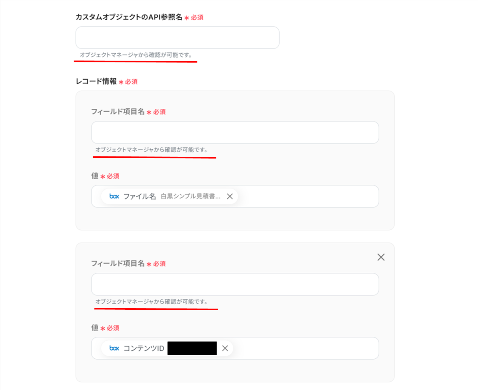 (3)「API接続設定」画面から、カスタムオブジェクトのAPI参照名、フィールド項目名、は赤線を確認の上、直接入力します。