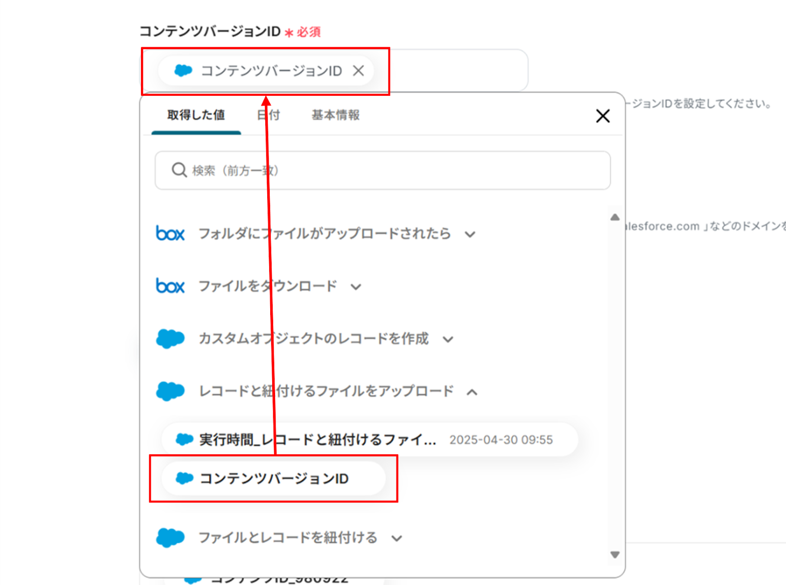 (1)次に、SalesforceにアップロードしたファイルのコンテンツIDを取得します。