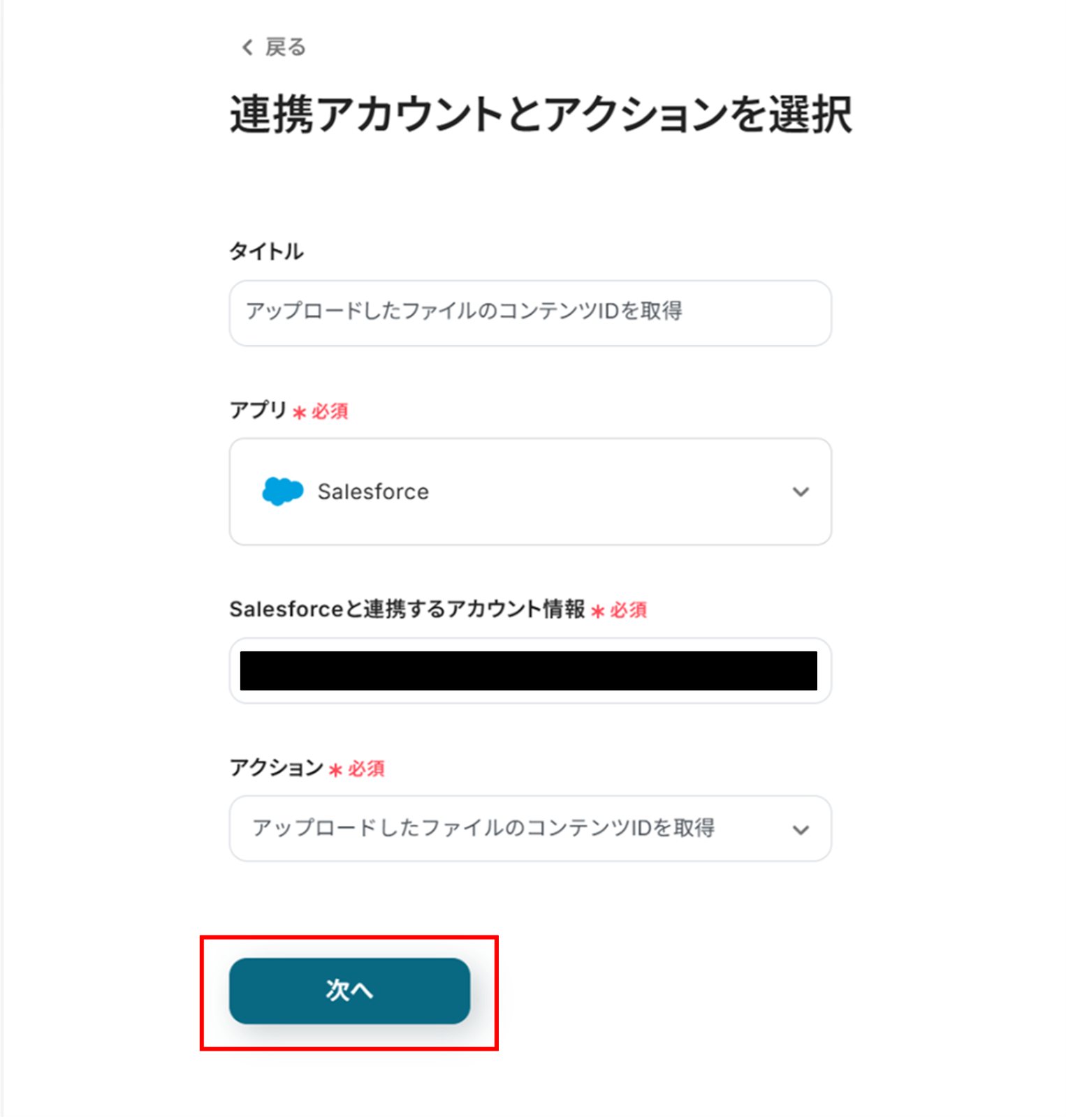 (2)Salesforceの「連携アカウントとアクションを選択」画面から、Salesforceと連携するアカウント情報に誤りがないかを確認し、アクションは「アップロードしたファイルのコンテンツIDを取得」のままで「次へ」をクリックします。