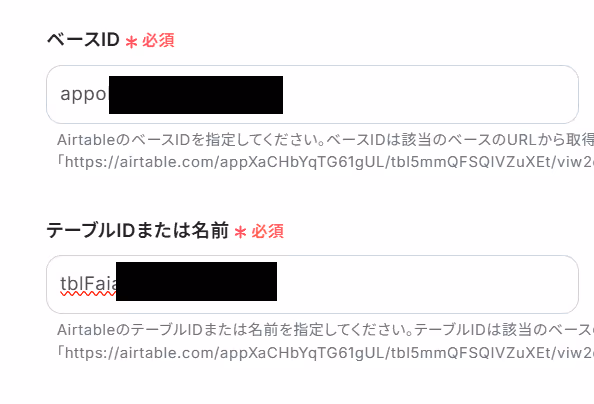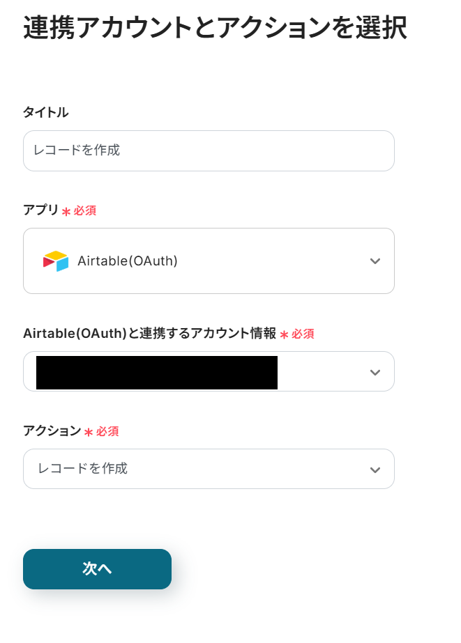 前項で取得した値から、Airtableにレコードを作成する設定を行います。