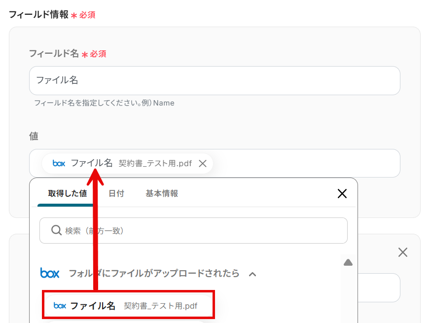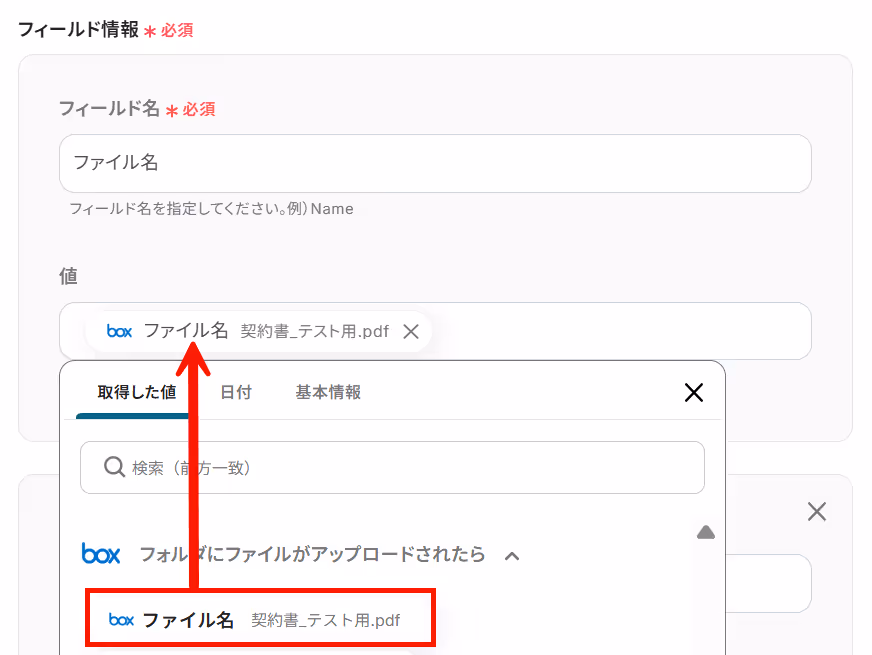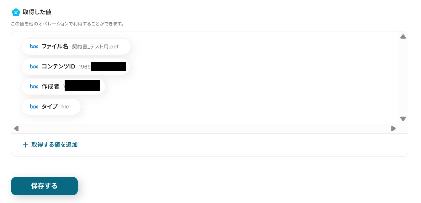 A:こちらの連携では、Boxのファイルの「ファイル名」「コンテンツID」「作成者」「タイプ」を取得した値として連携できます。