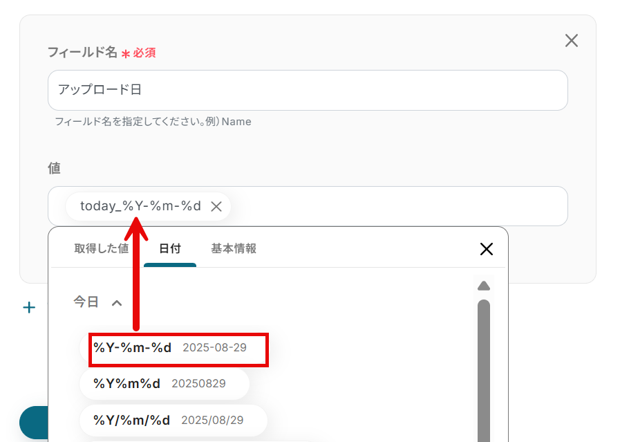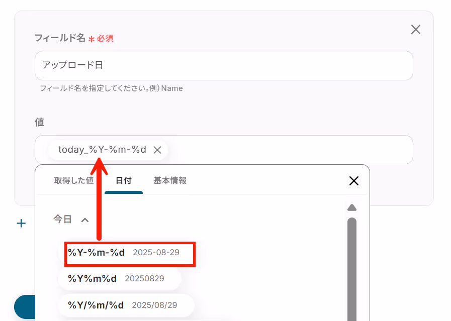 アップロード日の項目では、値は「日付」のタブから「今日」を選択しましょう。