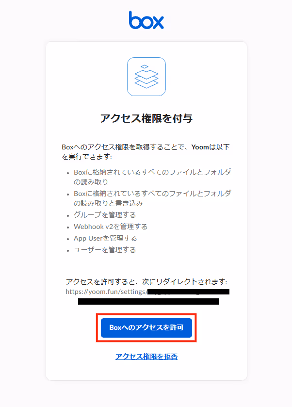 以下の画面から、「Boxへのアクセスを許可」をクリックします。