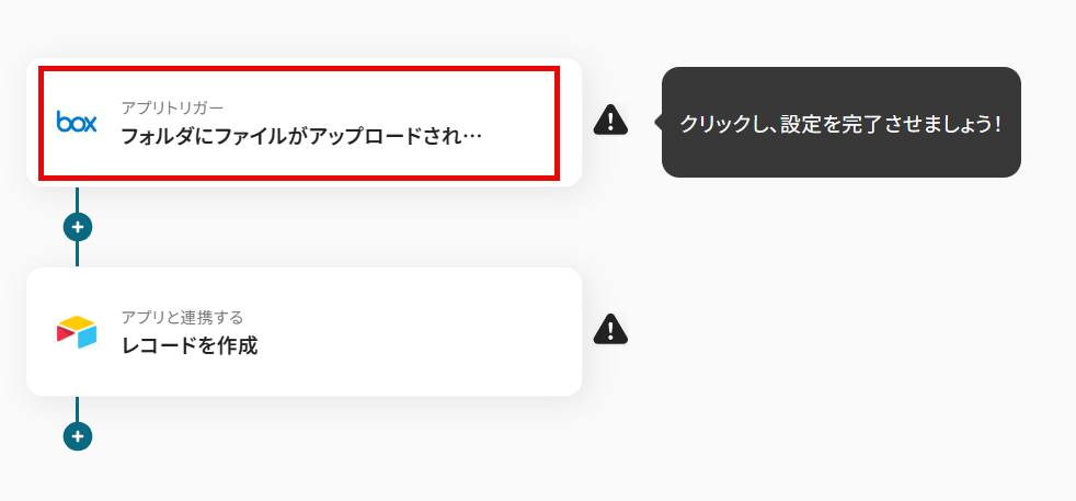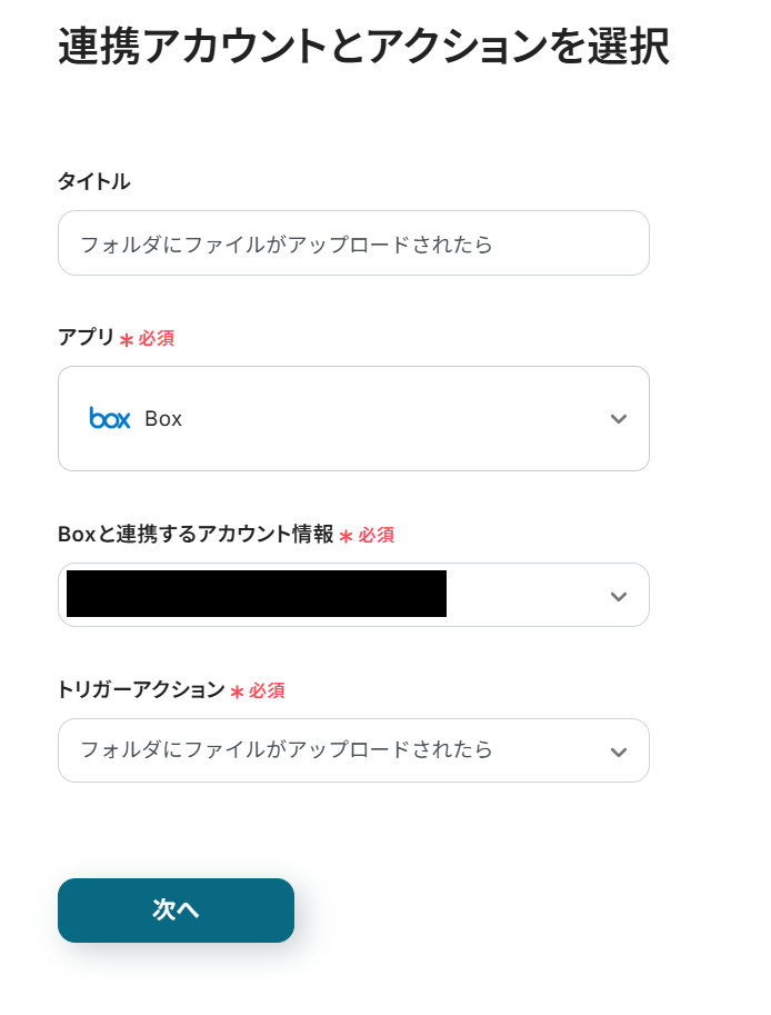 - トリガーアクション:Boxのフォルダにファイルがアップロードされたら起動します。