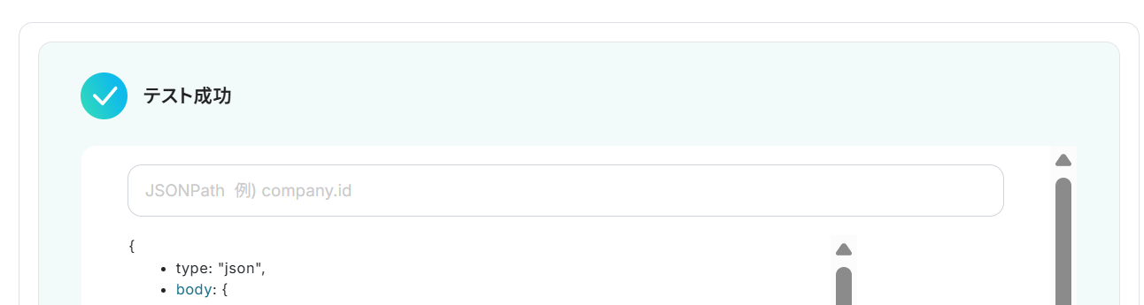 テストに成功すると以下のように表示され、取得した値が出力されます。次の設定で活用することで、Airtableにこれらのデータを自動連携可能となります