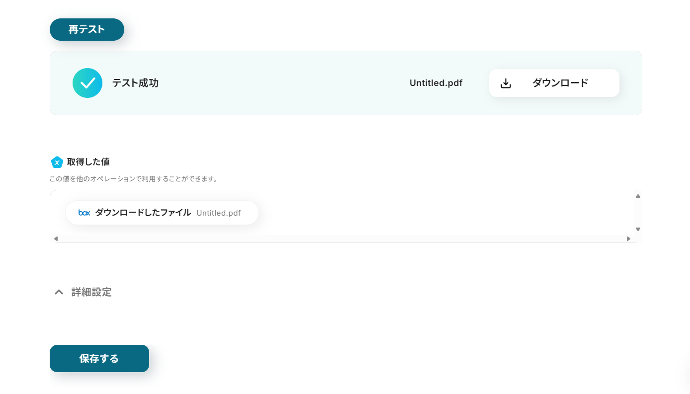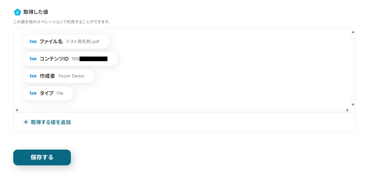 - テストに成功すると、「取得した値」にファイルの情報が追加されます。