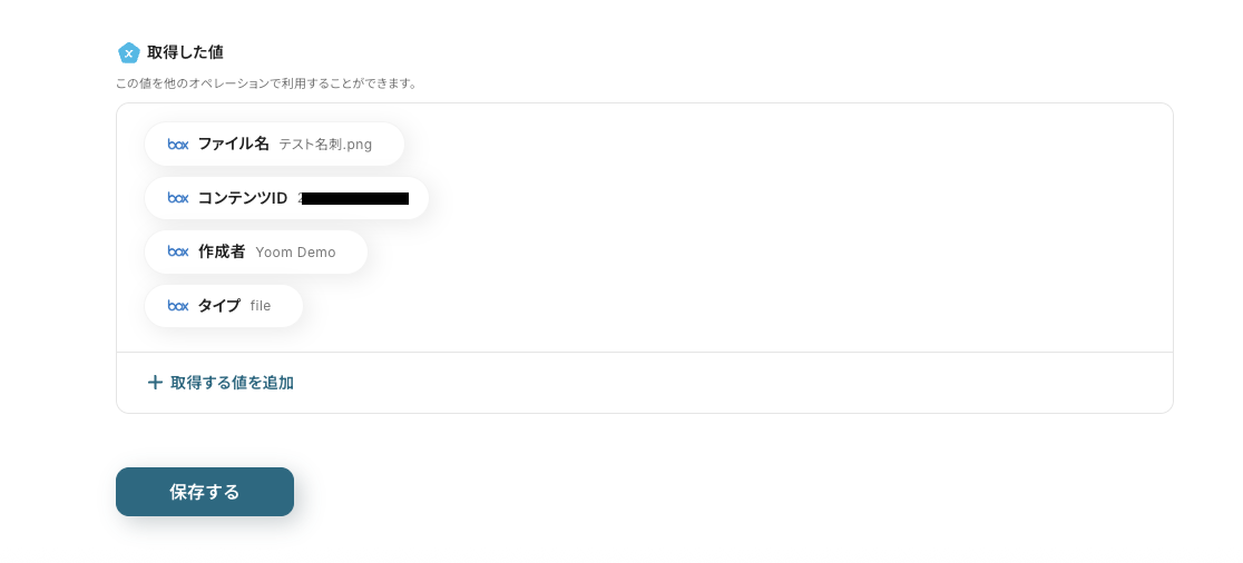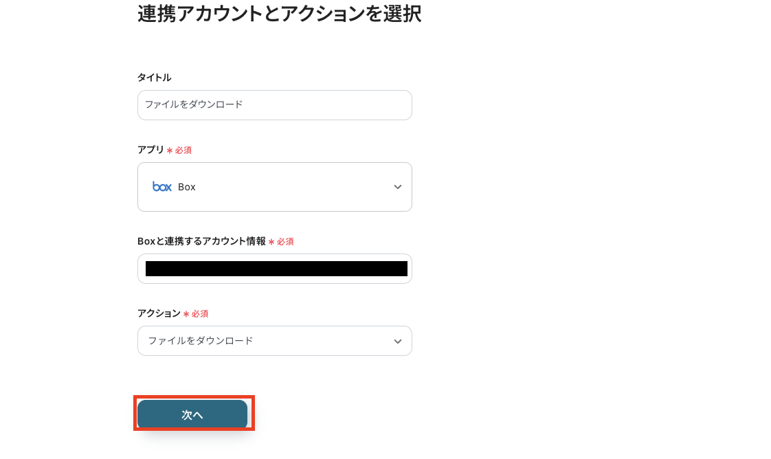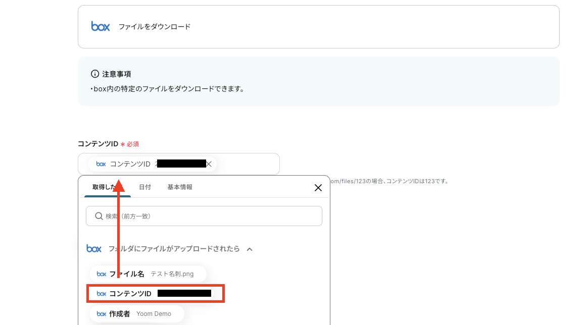 次に、2つ目の「ファイルをダウンロード」をクリックします。 ここではBoxにアップロードしたファイルをYoomのフロー上で活用するためダウンロードします。
