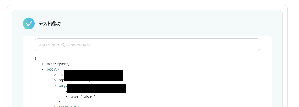 テストが成功するとテスト成功画面と取得した値が表示され、アップロードしたファイルのデータが確認できます。 「保存する」をクリックして完了です!取得した値について、詳しくはこちら をご参照ください。なお、この取得した値をこの後の設定で活用していきます。
