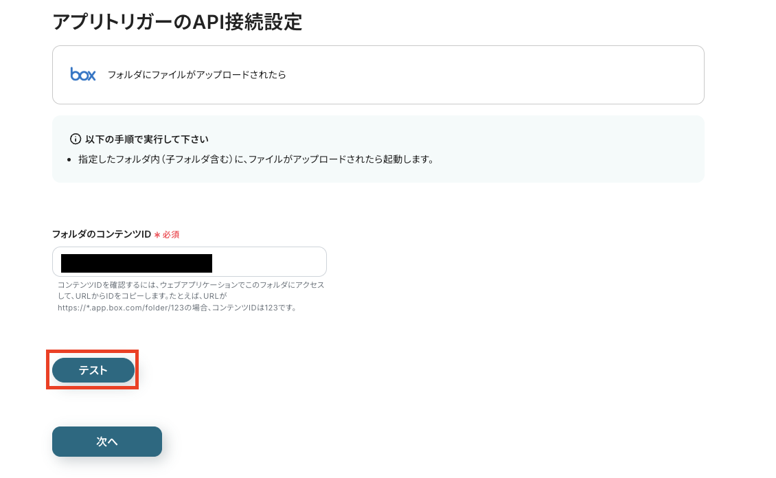 注釈に沿って、「フォルダのコンテンツID」を入力してください。入力後、「テスト」をクリックしましょう。