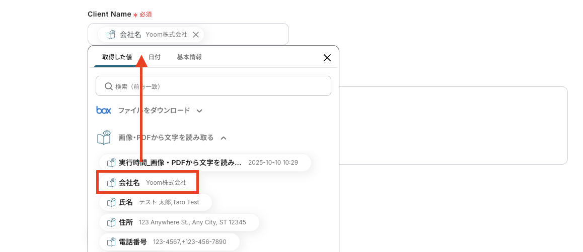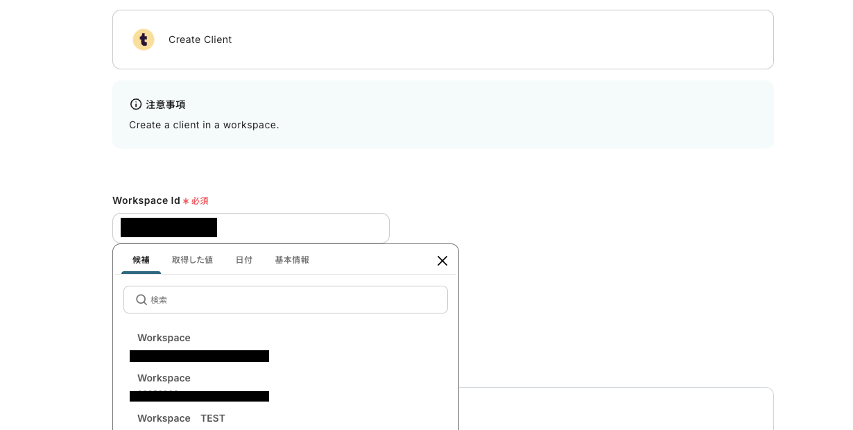 「Client Name」や「Client Notes」には、以下の画像のように、前ステップで取得した値を設定します。 このように取得した値を変数として引用することで、フローボット起動毎に異なる値が反映されます。 固定値を入れたまま設定してしまうと、毎回同じ値が登録されるのでご注意ください。