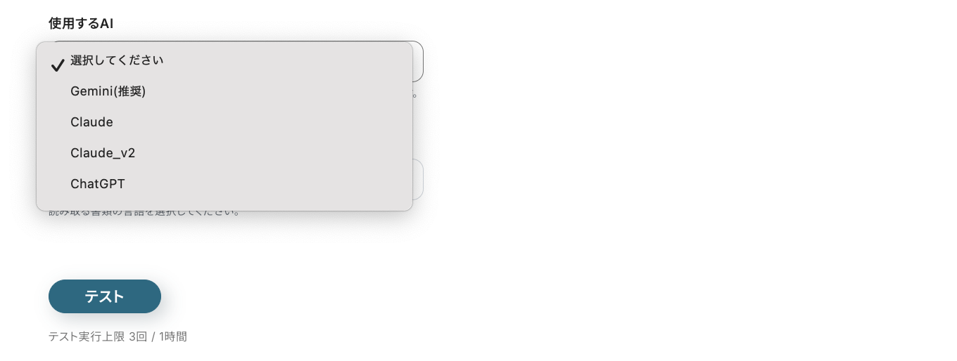 「使用するAI」を「Gemini(推奨)」「Claude」「Claude_v2」「ChatGPT」から選択しましょう。 AIモデルの違いはこちらのヘルプページ で説明されています。「言語」も運用に沿ったものをプルダウンから選択してください。