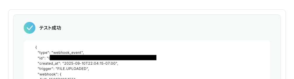 「コンテンツID」には、前ステップで取得した値を引用 してください。設定後、[テスト]をクリックします。