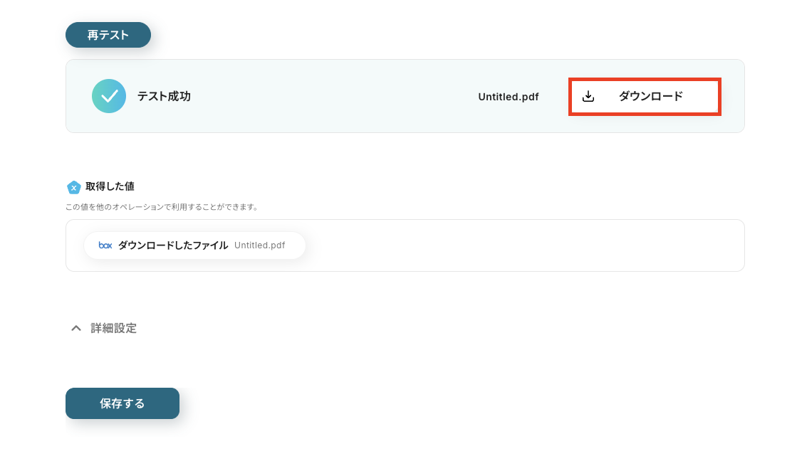 テストが成功したら、『保存する』をクリックしてください。 なお、取得したファイル名は「Untitled.pdf」に固定されていますが、【ダウンロード】を行うことで、中身を確認することができます。
