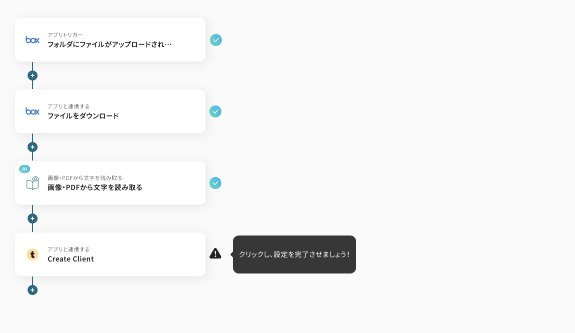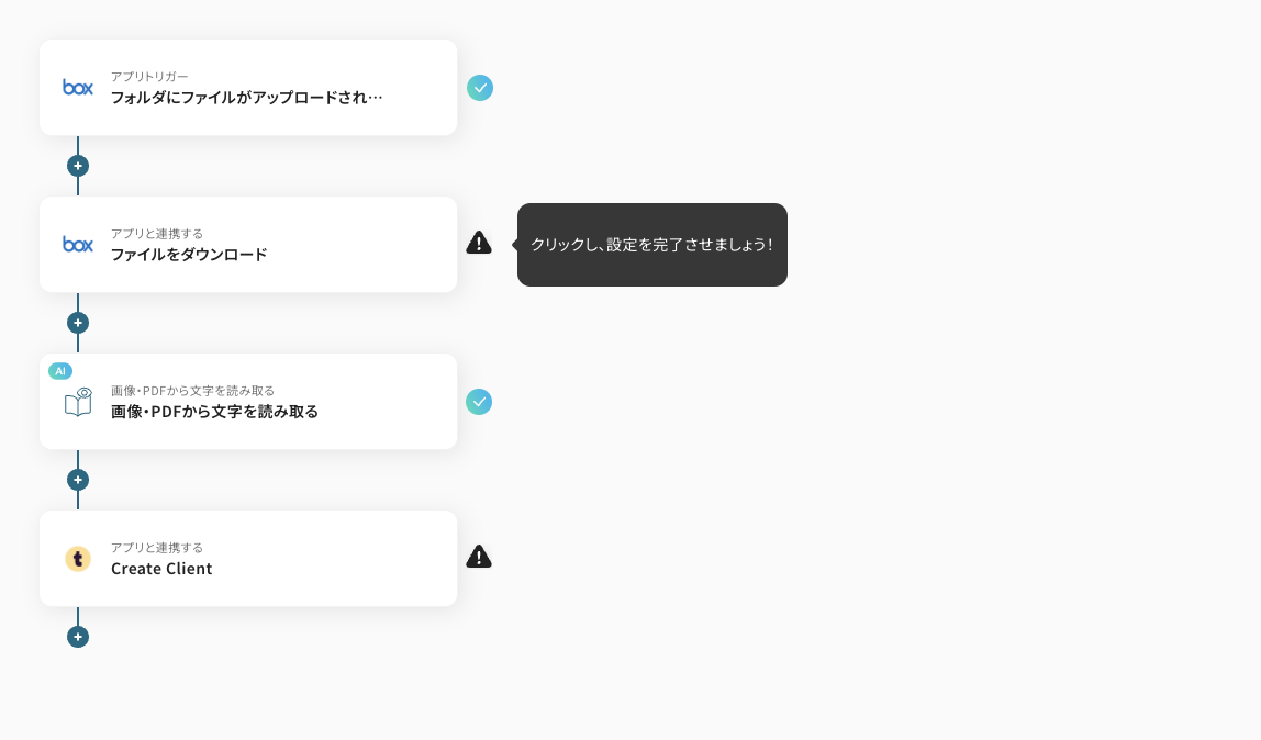 今回は「Boxにアップロードされた名刺をOCRして、TogglでClientを作成する」フローを作成していきます! 作成の流れは大きく分けて以下の通りです。