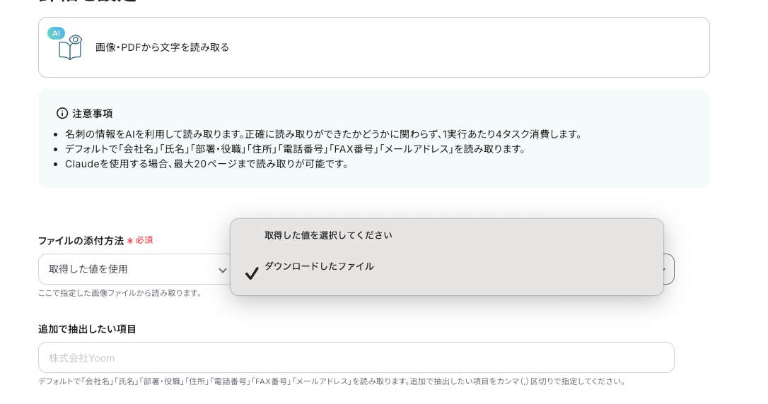 ファイルの添付方法は、「取得した値を使用:ダウンロードしたファイル」を選択します。 「追加で抽出したい項目」は、デフォルトで読み取る「会社名」「氏名」「部署・役職」「住所」「電話番号」「FAX番号」「メールアドレス」以外の項目 を入力してください。