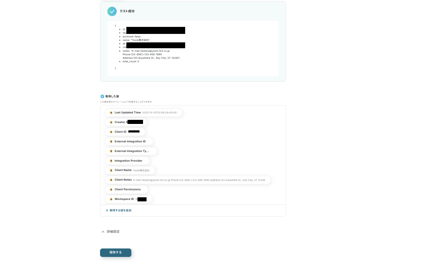 設定が完了したら、[テスト]を行いましょう。 以下のようにテストに成功すると、実際にTogglでClientが作成されます。