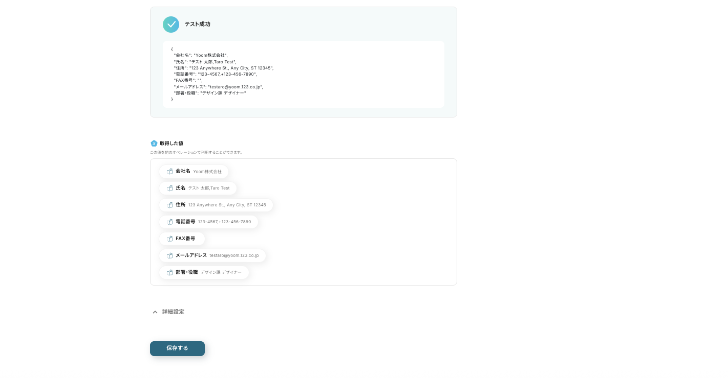 設定後、[テスト]をクリックしましょう。 テストに成功し、読み取りたい項目が取得できたら、保存してください。